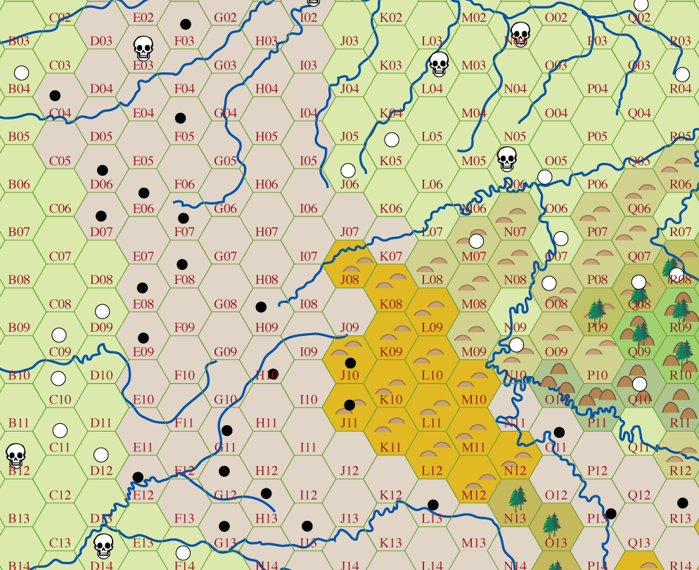 Here's a sample of most of a map I've adapted from the main campaign map that is meant for a sandbox version of one of the eras for The Mutant Front meant to appear as an article elsewhere.