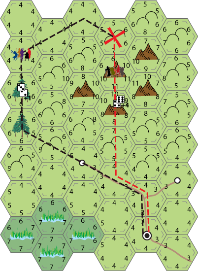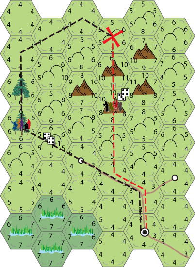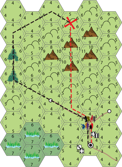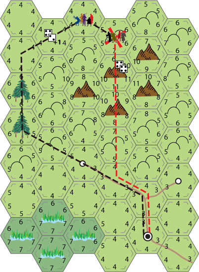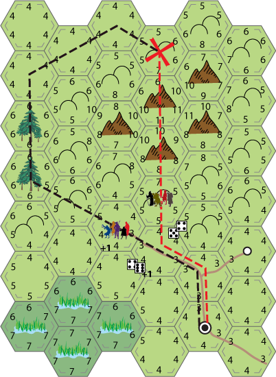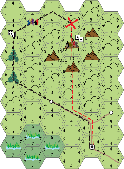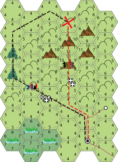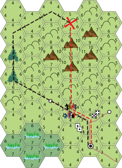 For this example I'm going to use a planned route assuming the players behind each party have access to a map which shows the hex terrain but not the travel scores (and can oddly enough follow a plan no matter what happens).