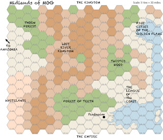 Here's my campaign map for MOG as I'm working on it. The terrain is simply colored hexes for now as things are going to walk about as I develop them. Only The city of Panthoom is currently positioned on the map. The party is currently rooting about some tunnels beneath ruins outside of a small trading town near hex 4-6. The labels are broad brushstrokes for what is in each area for now.