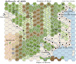 Development continues on the map of the midlands of MOG. Rivers and lakes have been placed on the map, cities and town nudged a bit and roads and routes have been blazed.