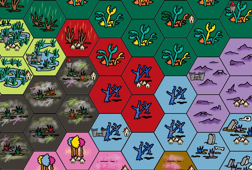 The purple hexes in the right are a blasted and twisted rocky expanse that would almost make the greenery of the carnivorous forest welcoming were it not for all the plants trying to eat you. To the west of the petrified forest there is a mist shrouded bogland where the remains of ancient dead can still be found bubbling to the surface and floating in fetid waters, no wonder some of the swamp to the north of that is choked with vile and nauseating gases and the more subdued fertile swamp land is defended by a castle.
